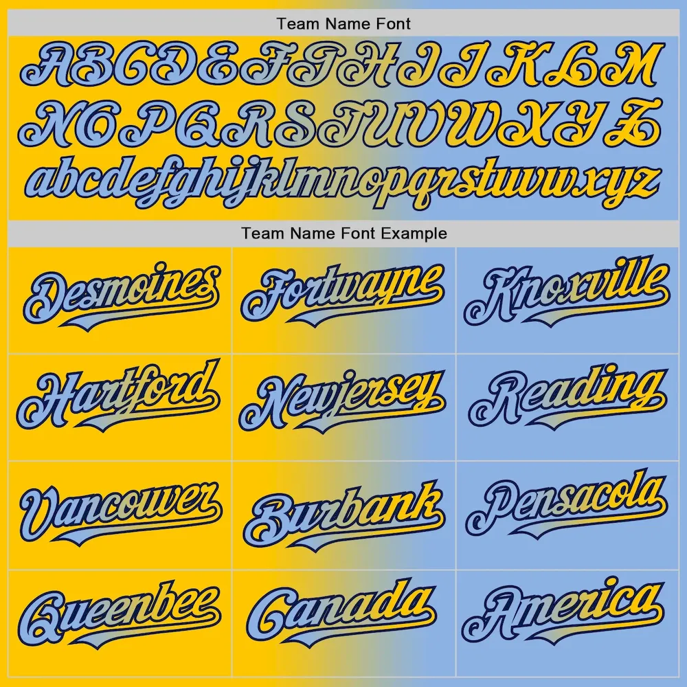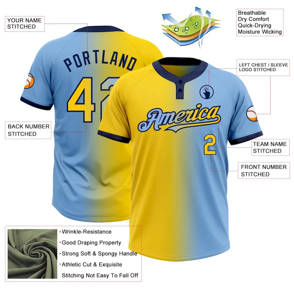 Custom Light Blue Yellow-Navy Gradient Fashion Two-Button Unisex Softball Jersey